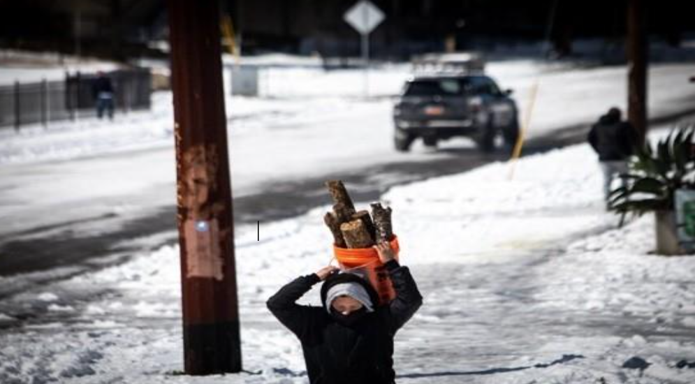 A person carries a bucket of firewood in South Austin during the winter storm in February 2021. Millions of Texans lost power in the storm.